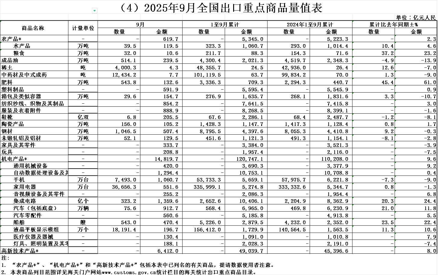 稀土方面,海关总署披露的多个方面数据显示,中国9月稀土出口4000.3吨,进口6864.7吨。中国1—9月稀土出口48355.7吨。