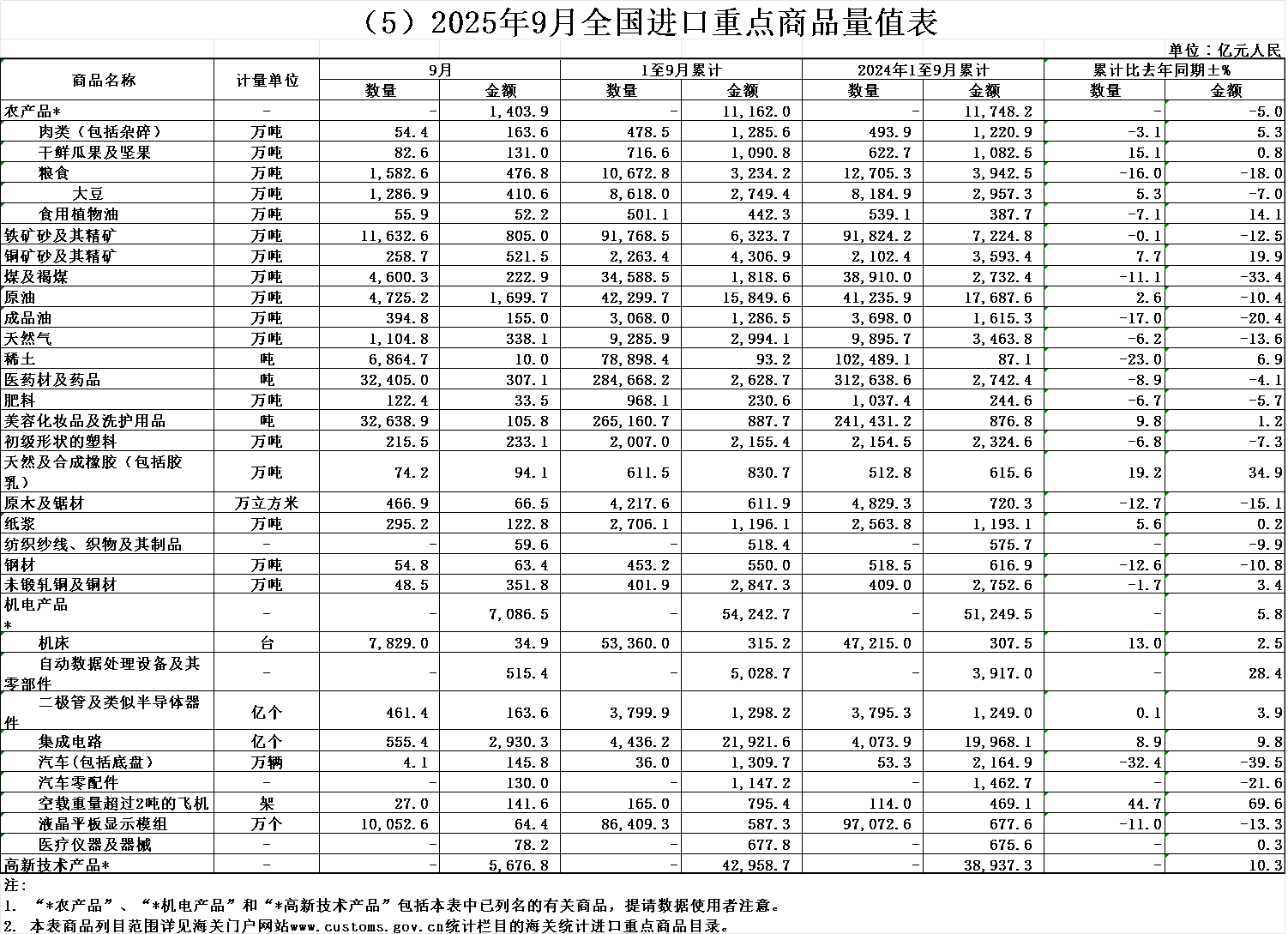 集成电路方面,中国9月出口集成电路323.2亿个,价值1359.6亿元,进口集成电路555.4亿个,价值2930.3亿元。